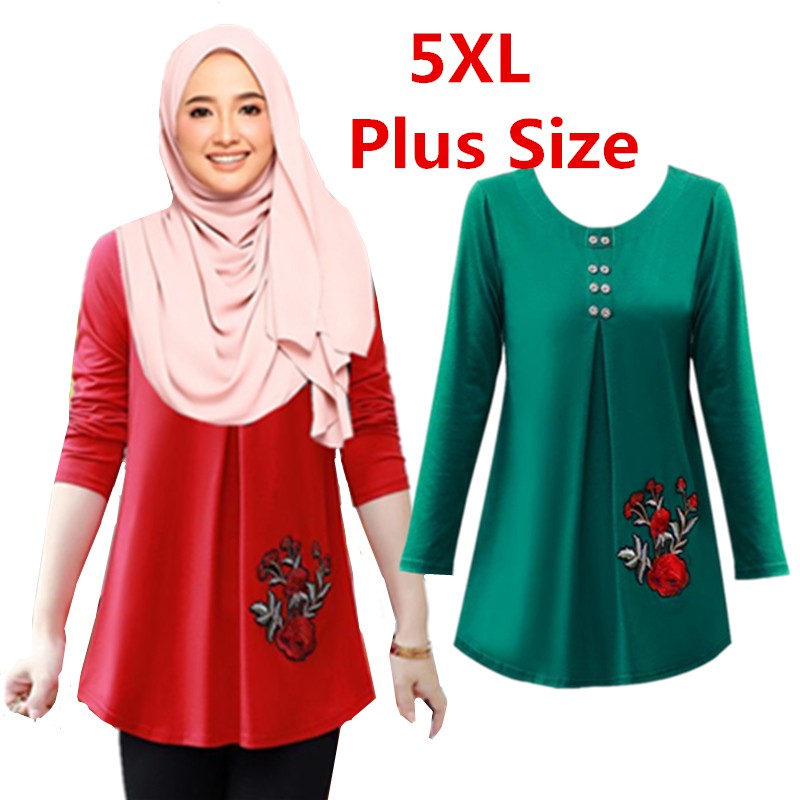 5xl Rose Embroidery Muslimah Long Sleeve Loose Plus Size Blouse Casual Shirt Tops Muslim Baju